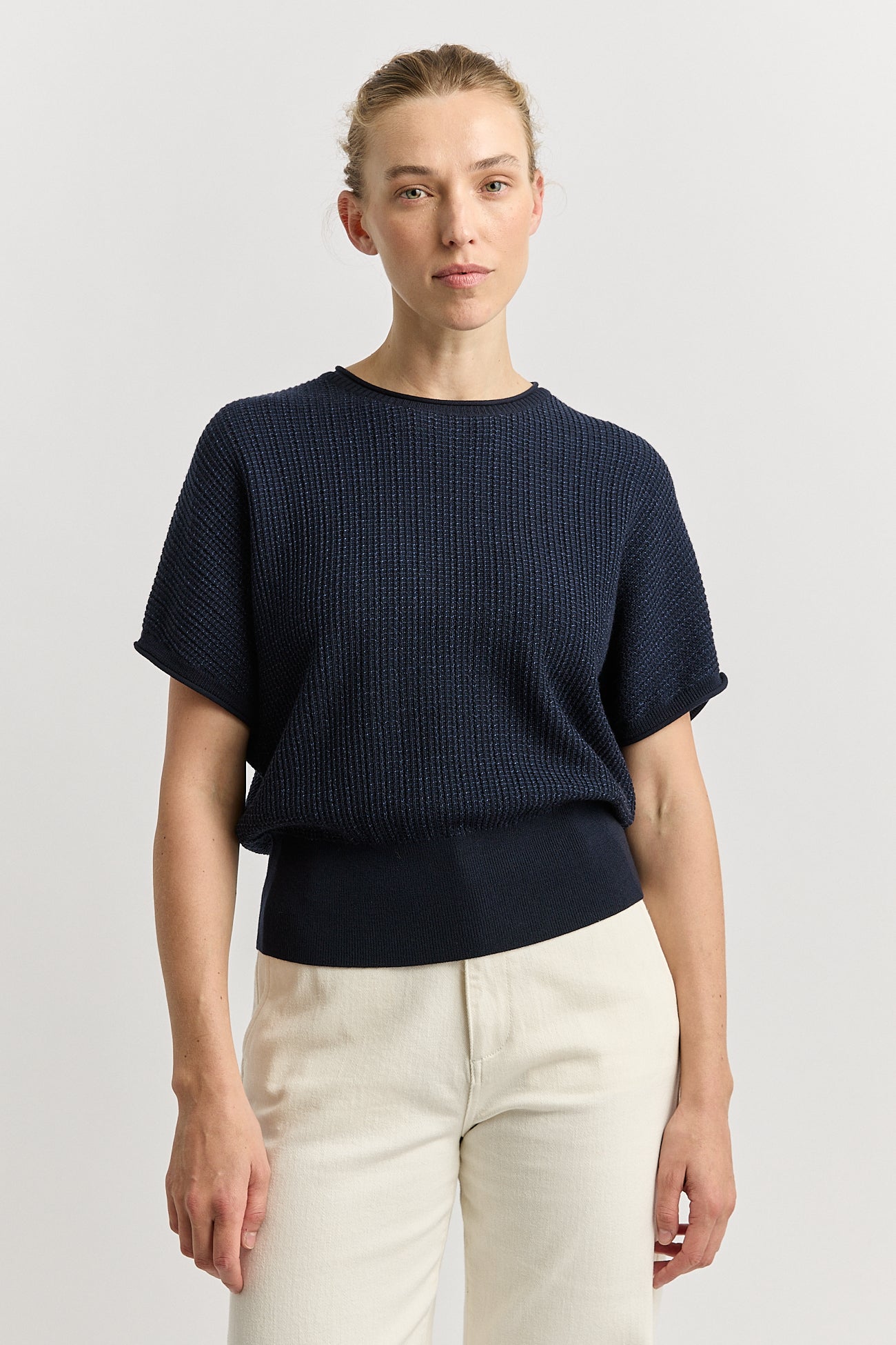 The Pointelle Knit Dolman Sleeve is a textured, perforated stitch knit rendered in a relaxed top, fitted at waist with a wide, fine rib waistband. The drop shoulders frame the boatneck and drape to an elbow-length sleeve.