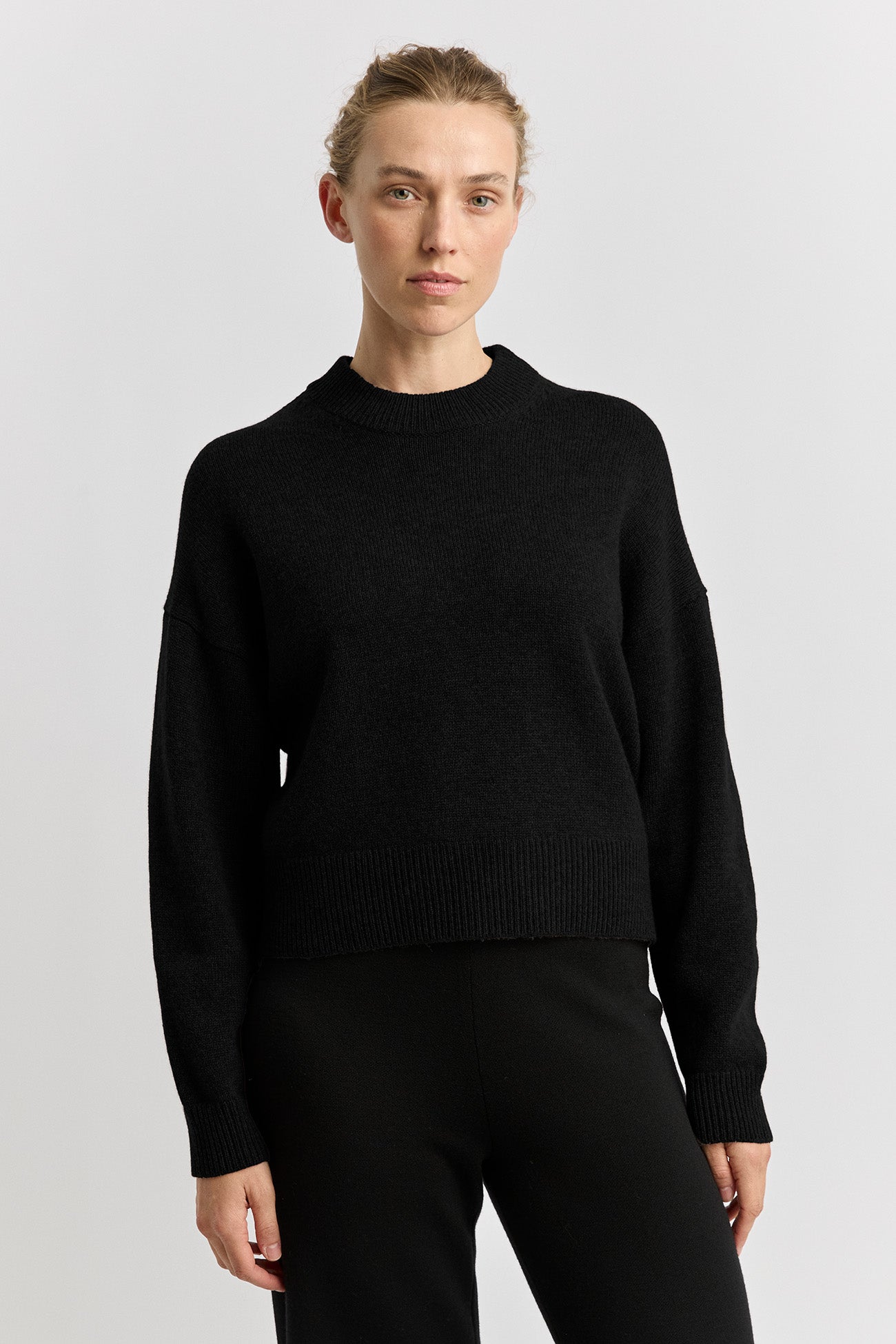 The Drop Shoulder Crew is a modern and practical jumper designed with a round neck, exaggerated drop shoulder, and cropped length. Finished with knitted rib trims.