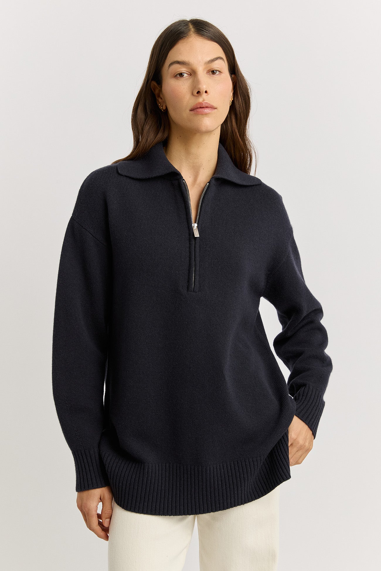 The Relaxed Longline Zip Polo has a relaxed shape starting with a drop shoulder and finishing at the low hip. The rib hem is detailed with side splits, and the polo collar has a quarter length zip with branded zip pull.