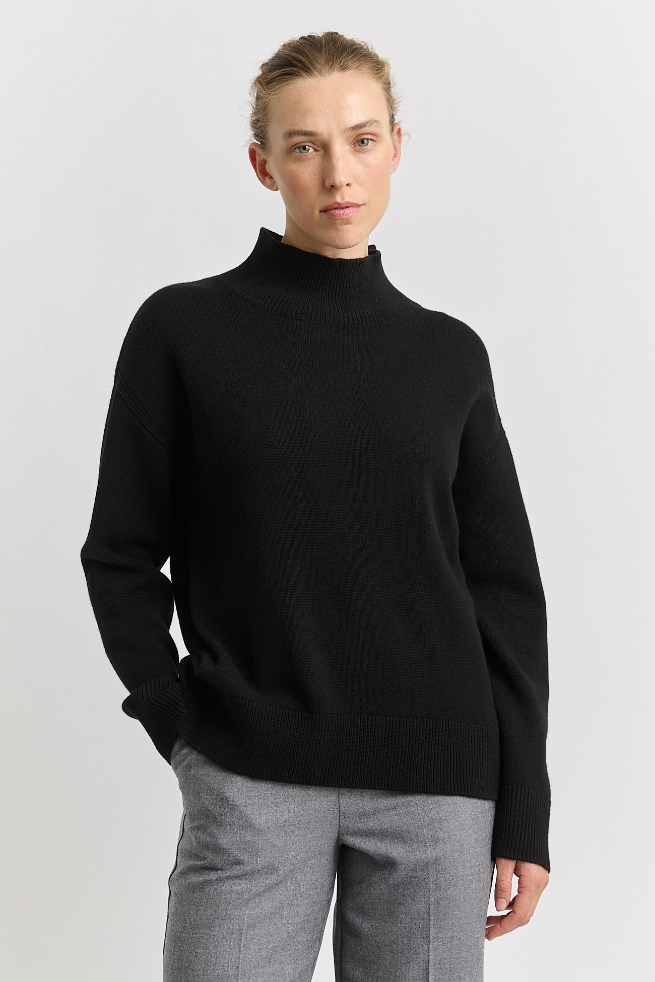 The Split Neck Funnel has a tall, rib standing collar detailed with a small split at the back. The relaxed fit is finished with a drop shoulder and a rib trim.