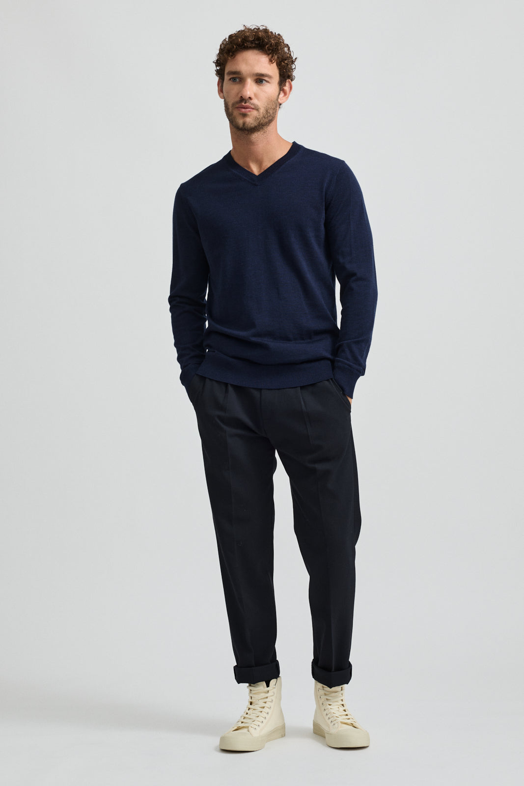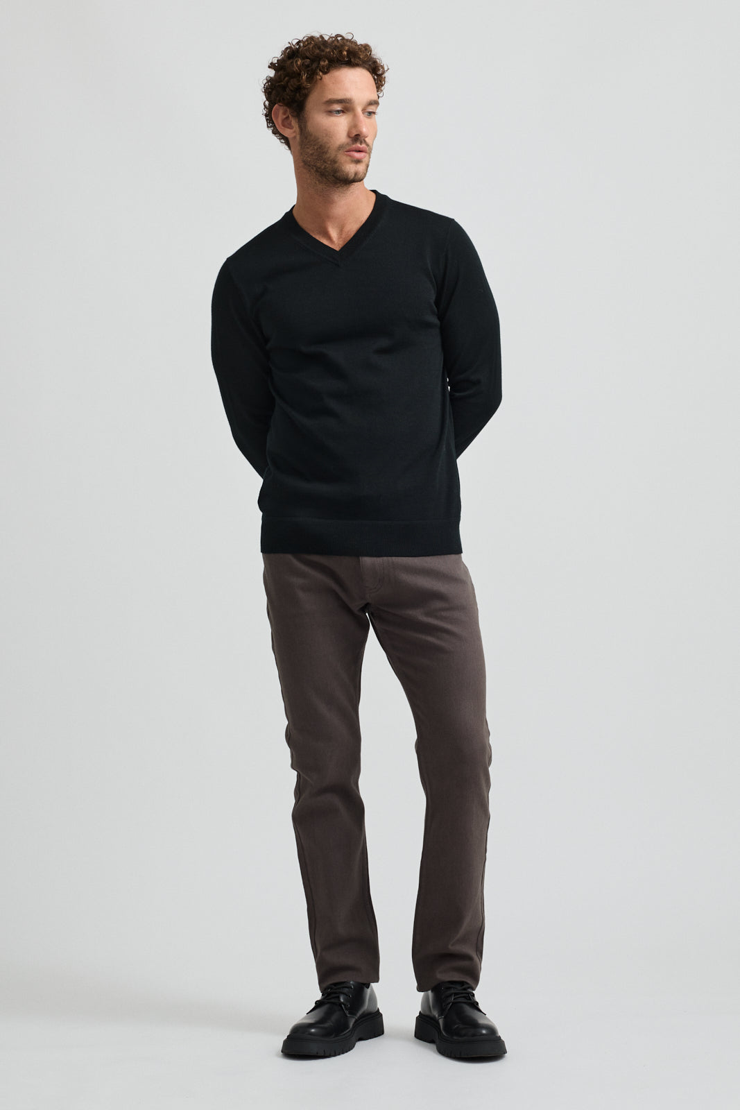 The Merino Wool measures 19.5 microns and is classified as superfine, meaning the wool fibre is resilient with a super soft feel. This garment is a single jersey knitted on a 14-gauge flatbed knitting machine.